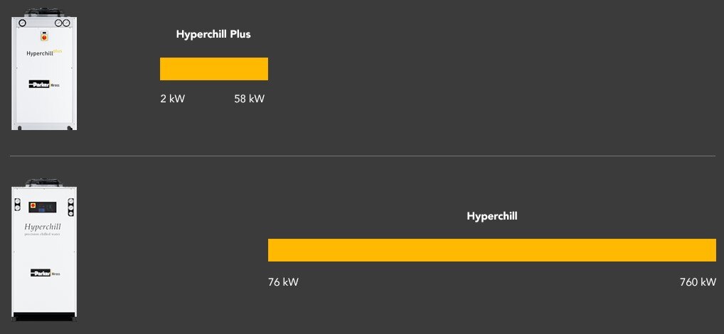 Parker bietet für seine Präzisions-Wasserkühlungstechnologie zwei Produktreihen an: die Hyperchill Plus (ICEP) Reihe und die Hyperchill (ICE) Reihe.