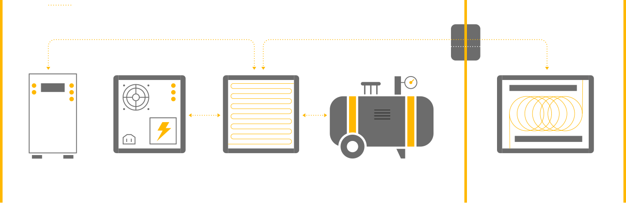 Kaltwassersätze können in das MRT-System integriert werden, um Kälteleistung auf verschiedene Weise bereitzustellen. In den meisten Fällen wird der Kaltwassersatz in Kombination mit einem Wärmetauscherschrank (HEC) verwendet, der sich im Geräteraum befindet (vom Magnetraum getrennt). Der Wärmetauscherschrank enthält Wärmetauscher, die an die Wasserversorgung vom Kaltwassersatz angeschlossen werden können. Auf diese Weise werden von dem Kaltwassersatz indirekt mehrere Anwendungen versorgt.