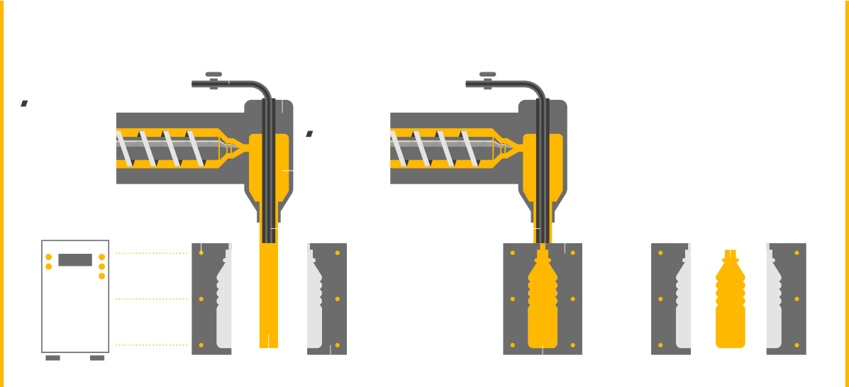 Beim oben dargestellten Prozess wird Kunststoff geschmolzen und mithilfe eines Einspritzextrusionsprozesses wird ein kleines, hohles Rohr erzeugt, das als Vorform bezeichnet wird.