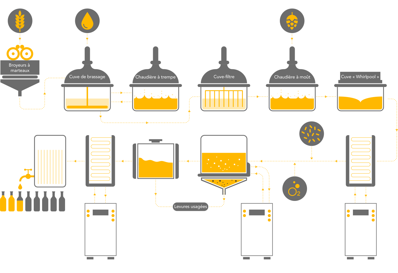 Pendant les étapes initiales du brassage, les grains sont moulus pour former la mouture. Celle-ci est transférée vers la cuve de brassage, et on ajoute de l’eau chauffée. Pendant le brassage, les enzymes naturelles de la mouture décomposent l’amidon du malt en sucres fermentables. Le mélange est alors pompé dans la cuve-filtre, où une liqueur sucrée (le moût) est séparée de la mouture.