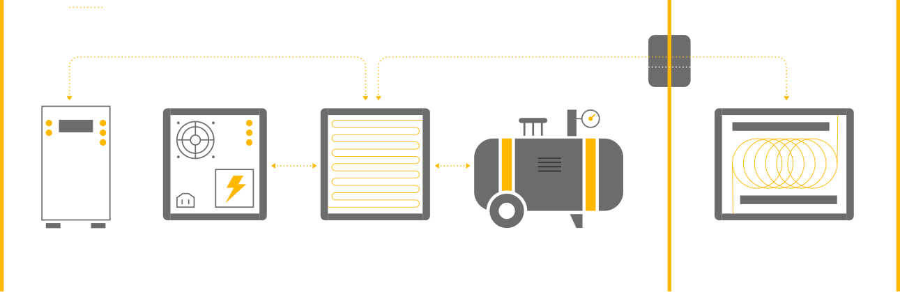 Des refroidisseurs peuvent être intégrés au système IRM pour assurer plusieurs types de refroidissement. Le plus souvent, le refroidisseur est associé à une armoire d’échange thermique (HEC) située dans la salle d’équipement (séparée de la salle des aimants). La HEC utilise des échangeurs thermiques qui peuvent être connectés à l’alimentation en eau du refroidisseur. Plusieurs applications sont alors refroidies indirectement par le refroidisseur.