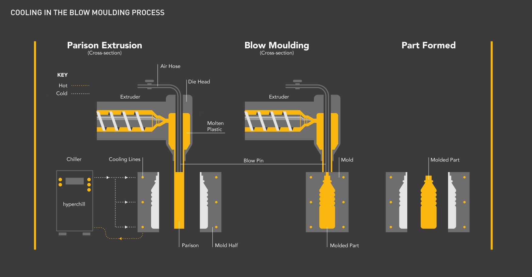 Because blow moulding typically uses an injection moulding technique to form the parison, the heat load from the hydraulic circuit powering the press must be removed.