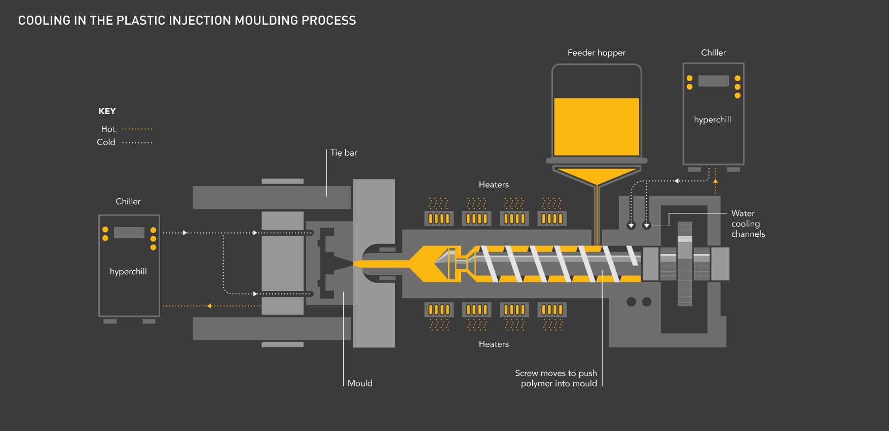 The injection moulding process consists of four stages. The cooling phase is critical to the process and often involves direct cooling from a chiller.