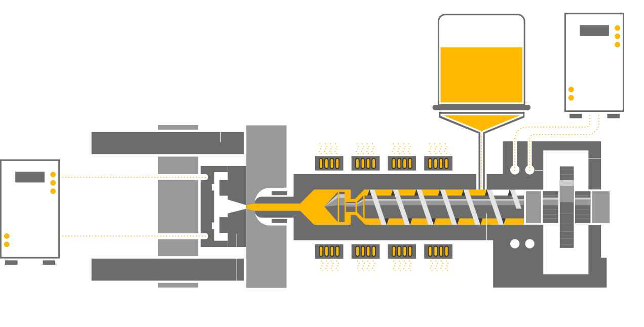 Nella macchina per stampaggio a iniezione viene introdotta materia plastica grezza (normalmente sotto forma di granuli), che entra poi nel gruppo vite. L’applicazione di calore e pressione fonde la plastica man mano che questa si sposta lungo la vite. La plastica fusa viene quindi rapidamente iniettata nello stampo fino a che questo non si riempia del tutto per effetto della pressione applicata.