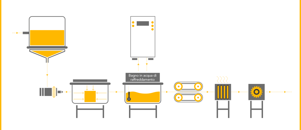 Attraverso la tramoggia di carico vengono inseriti, sfruttando la forza di gravità, granuli termoplastici che raggiungono così il cilindro dell’estrusore. Una vite rotante spinge i granuli di plastica in avanti all’interno del cilindro, riscaldato da resistenze fino alla temperatura di fusione desiderata. La forte pressione e l’elevato attrito all’interno del cilindro generano ulteriore calore.