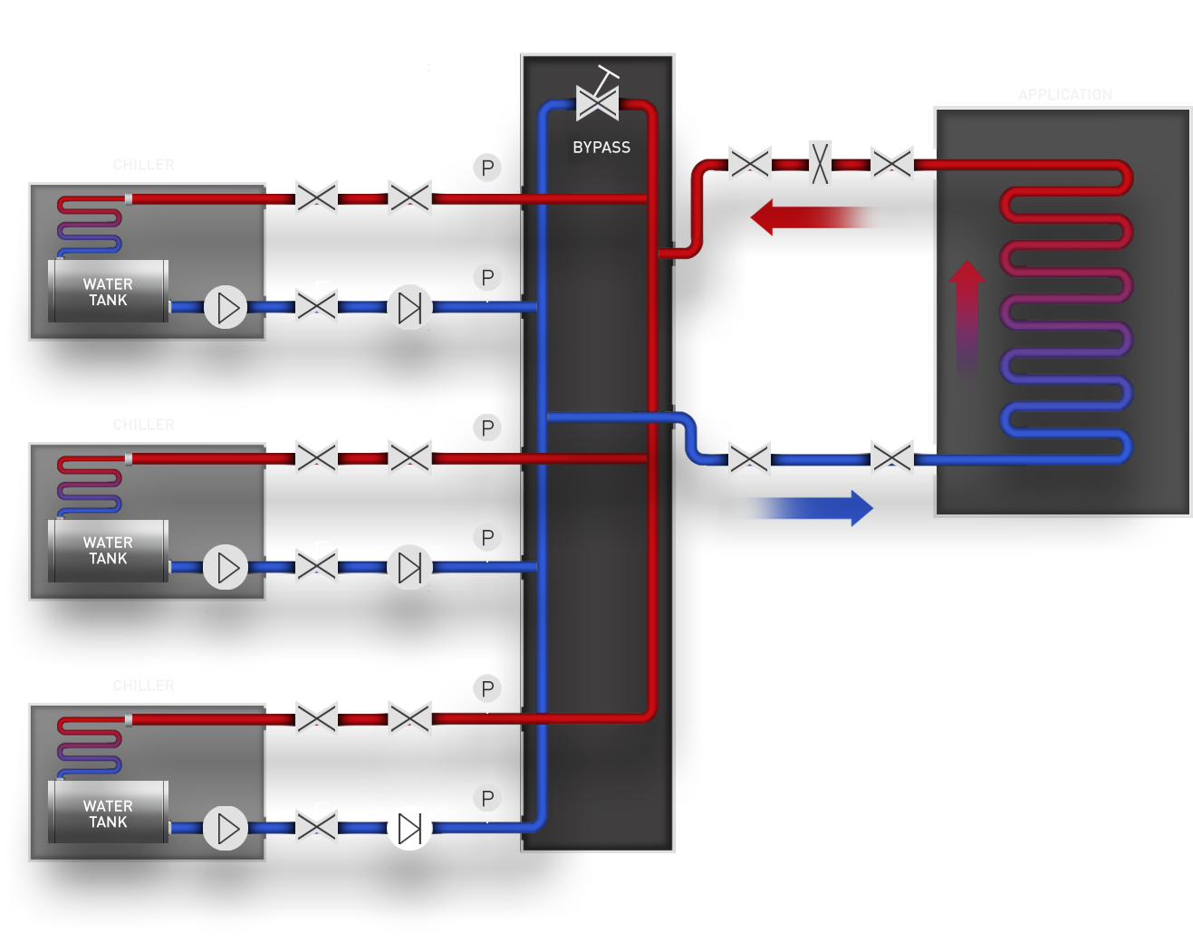 Multiple chillers can be configured together to remove large application heat loads. The system is generally designed around a common header. Additional chillers can be added to the header if the process cooling requirements increase.