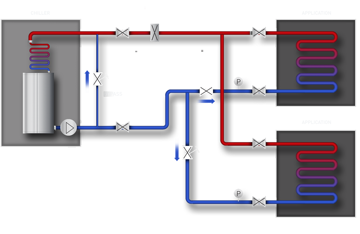 A single chiller can supply cooling capacity to multiple processes. A ring main layout is generally adopted in these instances. System flow must be carefully regulated to ensures an optimal flow of cooling water reaches each application.