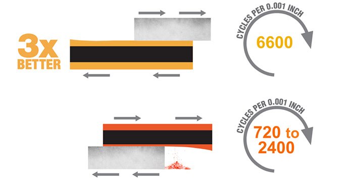 Many thermoplastic materials are inherently abrasion resistant. In fact, most rubber hose manufacturers add thermoplastic to hose covers to increase abrasion resistance of their hoses. Parflex® and Polyflex hoses with polyurethane covers have proven, through testing, that it takes 3 times the cycles to rub through .001 inches of cover when compared to competitive rubber hose that is touted as abrasion resistant.