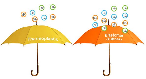 Through the use of various thermoplastics the permeation resistance (ingression and egression) can be far greater than rubber. As seen in the chart thermoplastic has superior permeation resistance against gases like CO2, Oxygen, and Nitrogen in comparison to rubber.